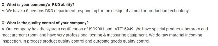 SGS, ROHS, IATF16949:2016 किंवा ग्राहकाच्या गरजेनुसार तृतीय पक्ष तपासणी उपलब्ध. |